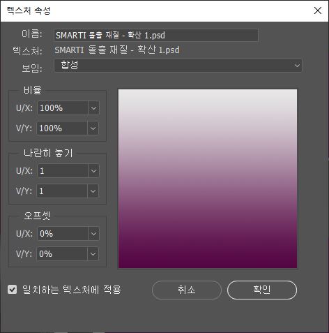 다시 작업 파일로 돌아가서 'smarti 돌출 재질' 탭의 속성창에서 확산의 폴더 아이콘을 눌러 'UV 속성 편집..'을