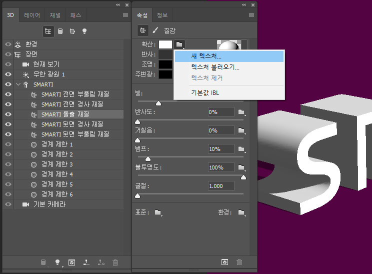 다음은 'smarti 돌출 재질' 탭을 선택, 속성창에서 확산의 폴더 아이콘을 눌러 '새 테스처..'를 선택한다.