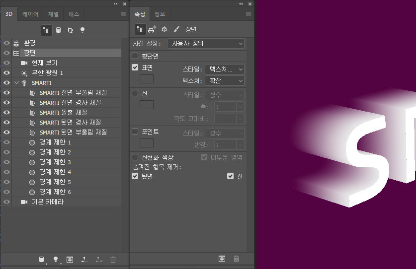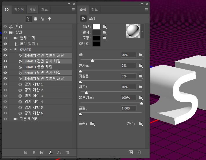 'smarti 전면 부풀림 재질', 'smarti 전면 경사 재질', 'smarti 뒷면 경사 재질','smarti 뒷면 부풀림 재질' 을 선택하고 속성 창에서 다음과 같이 수정한다.