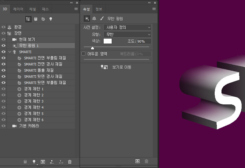 3D 패널로 가서 '무한 광원1' 선택하고, 속성창에서 색상 흰색, 조도 90%, 어두운 영역은 체크를 해제한다.