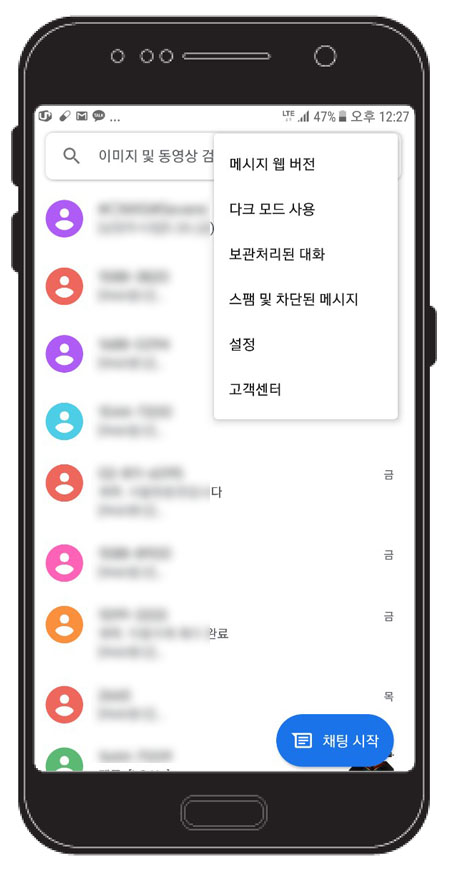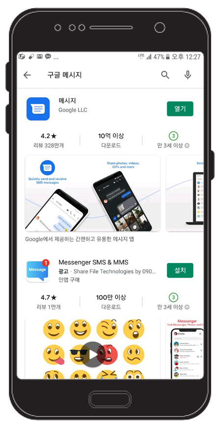 휴대폰에서 'play 스토어'로 들어가 '구글 메세지'를 검색하여 설치하기를 한다.