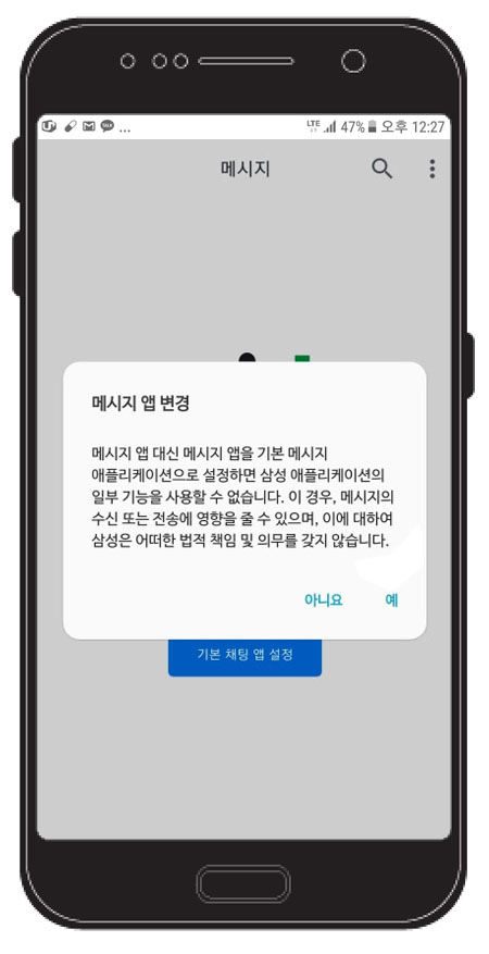 구글 메시지 앱을 실행하면, 처음 '기본 SMS 앱 설정' 누르고 메시지 앱 변경에서 '예'를 눌러준다.