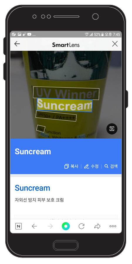 네이버 어플 중 스마트 렌즈를 알아보자. 휴대폰으로 사진을 찍어 인공지능(AI)으로 검색해서 정보를 제공하는 기능으로 상품이나 QR 코드 등 다양한 정보를 한 번에 확인할 수 있다. 그 중 번역 기능을 살펴보면 상품 설명이나 모니터에 나오는 외국어를 카메라로 찍으면 바로 번역해서 내용을 볼 수 있다.