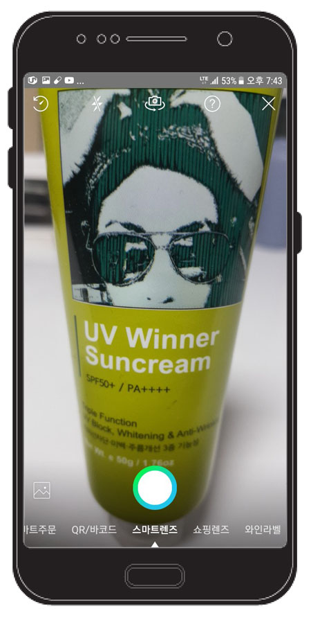 카메라 화면으로 넘어 가면서 하단에 '결제/스마트주문', 'QR/바코드', '스마트렌즈', '쇼핑렌즈', '와인라벨', '상품라벨' 을 선택할 수 있고, 기본 스마트렌즈로 원하는 문구에 초점을 맞추고 촬영을 해보자.