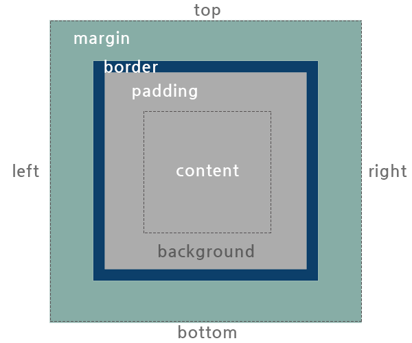 박스 모델은 아래와 같이 HTML 요소를 패딩(padding), 테두리(border), 마진(margin), 그리고 내용(content)으로 구분한다.