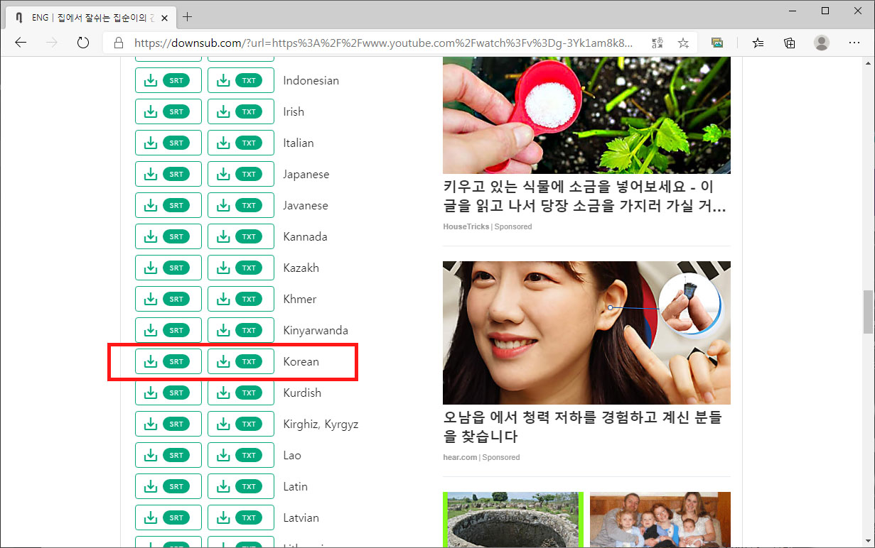 세번째 : 페이지 중간에 한국어를 선택할 수 있다. (확장자 .srt 또는 .txt를 선택할 수 있다.)